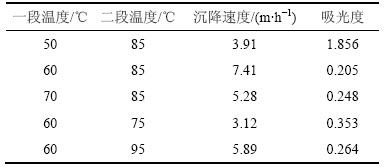 2) 清效果测定。赤泥浆液沉降10 min后,取上清液,用分光光度计在440 nm波长下测其吸光度,以表征其澄清度。吸光度越大,表示溶液透光率低,溶液澄清度差,浮游物质量分数高。