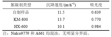 用上述方法合成的氧肟酸型絮凝剂,与工业常用的絮凝剂Nalco9779(聚丙烯酸铵)、埃森KM800(氧肟酸)、氰特HX600(氧肟酸)、A661(聚丙烯酸钠)进行赤泥沉降实验对比。控制各絮凝剂用量为250 g/t干赤泥,考察不同类型絮凝剂对进口铝土矿低温拜耳法溶出赤泥浆液分离沉降的影响,结果如表7所示。
