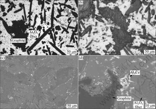 The microstructures of the composites with different Ce contents are shown in Fig.1. It reveals that the added graphite particles and Al2O3 short fibers disperse uniformly in the composites and no agglomeration and casting defect are observed evidently. The graphite takes the form of block and the Al2O3 short fibers appear in round and needle shape. Compared with the composite without Ce, the grain size of the composite with Ce becomes smaller. It is because that in solidification, Ce is likely assembling along the grain boundaries and restrains grains from growing up. Fig.1(c) shows the backscattering SEM image of the composite, and some white phases that have needle shape are found around the boundaries of graphite. It is Al3Ce phase confirmed by XRD analysis. The electronegativity of Ce makes Ce form Al3Ce phase with Al in preference.