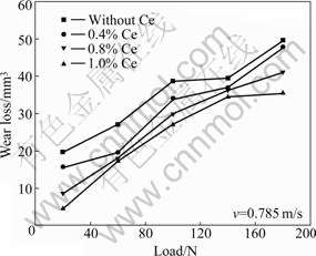 The variations in wear loss with load of the composites with various Ce contents are shown in Fig.2. It reveals that the wear loss increases with increasing the test load for all composites. Under the given condition, the composite containing Ce shows better wear resistance