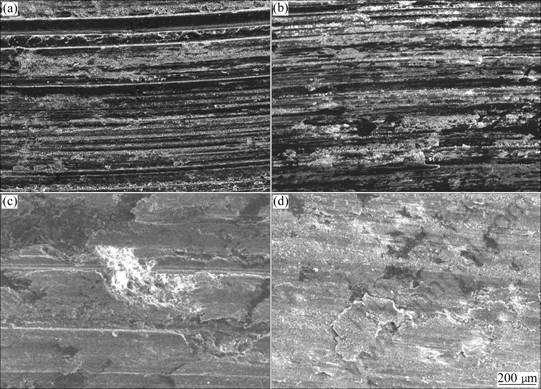 Fig.3 SEM images of worn surface of composites at different loads: (a) w(Ce)=0, 20 N; (b) w(Ce)=1.0%, 20 N; (c) w(Ce)=0%, 180 N; (d) w(Ce)=1.0%, 180 N