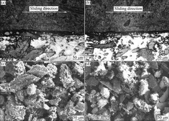 Fig.4 OM photographs of lengthways profile of composites at load of 180 N and SEM images of debris: (a) OM, w(Ce)=0; (b) OM, w(Ce)=1.0%; (c) SEM, w(Ce)=0; (d) SEM, w(Ce)=1.0%