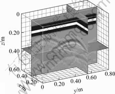 图2所示为3个球状空洞体不同位置的y向雷达切片图,图3所示为3个球状空洞体不同位置的x向雷达切片图。显然,由于3个小空洞的位置与埋深的变化导致切片图中绕射波形发生变化。图4所示为3个球状空洞体三维正演x=0.24 m,y=0.55 m和z=0.37 m的雷达立体剖视图,图5所示为3个球状空洞体三维正演x=0.24 m,y=0.55 m和z=0.37 m的雷达切片图,由于模型中存在3个球体小空洞,使得雷达三维正演剖面中3个球体小空洞所在的位置产生双曲线绕射波。正是由于存在这些绕射波,雷达正演合成图不能真实地反映3个球体小空洞的空间形态。为了提高雷达资料的解释精度,必须对正演合成的三维雷达剖面进行偏移处理。图6和图7所示为3个球状空洞体正演剖面经小波域偏移处理后三维效果图,它们分别对应偏移处理前的三维效果图图4和图5。通过对比偏移处理前、后的三维雷达图片可知,该偏移算法对坐标分别为(0.20, 0.30, 0.20),(0.30, 0.60, 0.35),(0.45, 1.00, 0.40)的3个球状空洞体,对所产生的绕射波进行聚焦处理,其发散的能量收敛到球体空洞所在的位置,基本恢复了球体小空洞的形状。由此可见,小波域三维偏移算法可以提高三维雷达图像的分辨率。