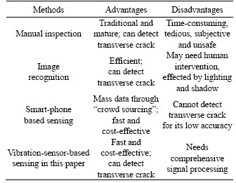 The comparison of four pavement condition survey methods and the vehicle-based sensing method proposed in this paper is shown in Table 1.