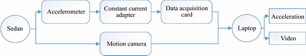 The vibration sensing system (shown in Figure 2) is constituted by a sedan, a piezoelectric accelerometer, a constant current adapter, a data acquisition card, a laptop, and a motion camera. The total price of the sensing system is about 1000 $, which is more expensive than an ordinary smartphone embedded with an accelerometer. However, the accuracy and sampling frequency are much higher. More importantly, the vibration sensor can be mounted on more places for its small size (the diameter is 17 mm, the height is 22 mm). The acceleration sensor was installed on the right front suspension knuckle. Therefore, the accelerometer is not subject to the vibration isolation system, making the sensor more sensitive to the road excitation.