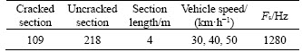 The section length cannot be long since the crack may not affect the signal on a long profile. The length should not be too small as it would result in fewer sampling points, which is not conducive to signal analysis such as Fourier transform. Hence, the length of the vibration signal at one section is selected as 4 m. The number of sampling points in one section can be determined by the driving speed and sampling frequency (Fs). The sampling frequency is supposed to be high in case of high vehicle speed. Fs is therefore set to 1280 Hz. The key parameters in the testing are shown in Table 2.