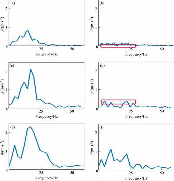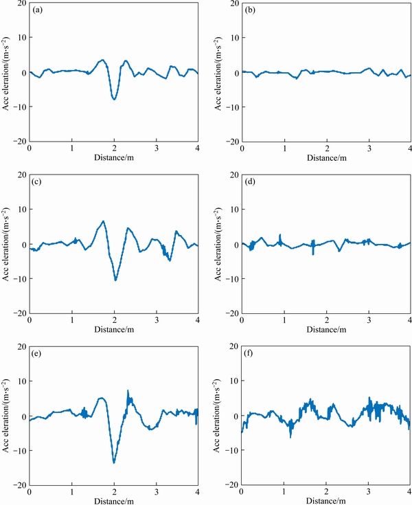 Figure 5 Vehicle acceleration spectrum at (a) Crack30, (b) Uncrack30, (c) Crack40, (d) Uncrack40, (e) Crack50, (f) Uncrack50