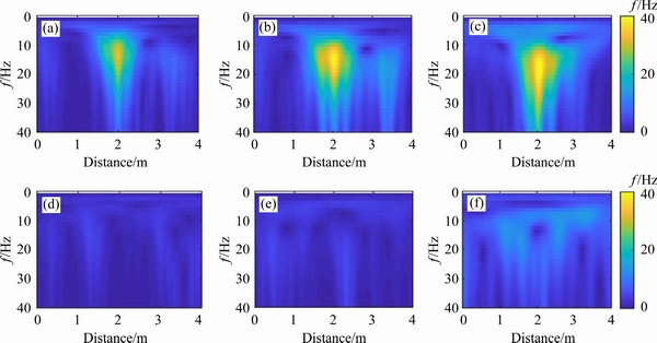 The wavelet transform can highlight the signal similar to the wavelet base through amplifying its wavelet coefficient. Continuous wavelet transform was performed on the vehicle vibration signal, and Figure 6 shows the distance-frequency diagram of one pair of the signal. A transverse crack occurs at 2 m of the cracked section, and the color-bar represents the wavelet coefficient. The existence of the transverse crack makes the wavelet coefficient at 10-20 Hz prominent. Also, a higher speed (v=50 km/h) may have a larger wavelet coefficient and wider scope of influence compared with a lower speed (v=30 km/h).