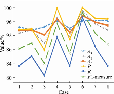 The training accuracy (At), generalization accuracy (Ag), overall accuracy (Ao), precision (P), recall (R), and F1-measure for the eight classification models are plotted in Figure 7.