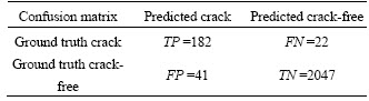 As can be seen from Table 9, the accuracy of the test result is 97.25%, which is desirable. The precision value is relatively low, indicating that some of the uncracked sections are misidentified as cracked sections (FP=41). This may be caused by the presence of debris on the road, such as small stones. FN=22 implies that some cracks are misidentified as non-crack because they are too tiny and the vibration signal shows little difference with the signal of uncracked pavement. In general, Table 9 shows that the proposed method demonstrates robust performance; hence such a method may be used as a fast detection method for transverse cracks in asphalt pavement.