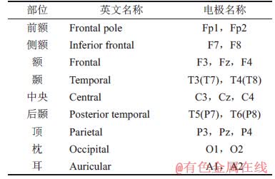 EEG信号图是指以从人的头皮表层采集到的电信号以电位作为纵轴,以时间作为横轴,所得到的电位与时间的相互关系平面图。由于人的大脑活动十分复杂,并且大脑各神经细胞的分布也不是均匀的,所以,由单个电极采集的EEG信号其实是大脑不同分区和各种类型的脑电波所叠加而成的信号。EEG信号具有频率、波幅和位相3个基本特征[12]。在大脑进行不同的思维活动时,EEG信号的基本特征会产生相应变化。EEG信号是通过非植入式的BCI系统采集得到的,由于需要采集电极与头皮进行有效接触以采集EEG信号,因此电极的导联组合十分重要[13]。目前,在EEG研究中电极安放通常采用国际脑电图学会标定的10-20电极导联定位标准,其中,10-20表示每个电极与邻近电极的距离为大脑垂直中心线(鼻根至枕外粗隆的前后连线)或水平中心线(左右耳廓UI高点之间的连线)的10%或20%。电极名称用电极位置所在的头部分区的英文单词首字母加上国际通用的阿拉伯数字来表示,如表1所示。表1中,以中心线为基准,左侧部位电极名称中的数字为奇数,右侧为偶数,正中位为零点(zero),如A1和A2分别为左、右耳垂电极名称。接近中线用较小数字,较外侧用较大数字。10-20电极导联定位方法示意图如图1所示。