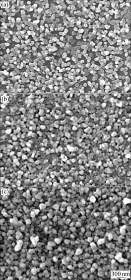 Quartz substrates (1 cm × 1 cm) were prepared by silanized method reported by ASLAN et al [11]. APS-coated quartz substrates were immersed in the silver seed solution for 2 h, rinsed with deionized water, and then dried in a stream of nitrogen gas. In the reduction process, the growth solution contained 50 mL of 0.01 mol/L AgNO3, 50 mL of 1.5 mmol/L tannin, 5 mL of 0.01 mol/L sodium dodecyl sulfate and 300 mL of deionized water. And the aqueous solution was separated into three portions: 40.5 mL (I), 81 mL (II) and 121.5 mL (III). Then, the silver-seed-coated quartz substrates were immersed in these aqueous solutions and deposited in darkroom at room temperature for 24 h.