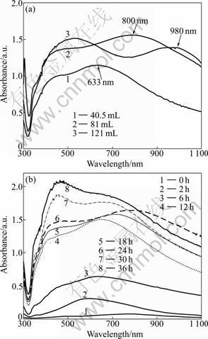 Fig.5 UV-Vis absorption spectra of products at 24 h: (a) Different volume of solution; (b) Different reaction time