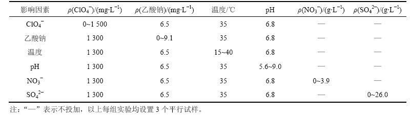 ClO4-还原的序批实验(SBR)在250 mL的培养瓶中进行。在250 mL的培养瓶中加入驯化好的高氯酸盐混合菌、特定质量浓度的高氯酸钠和乙酸钠,然后加入培养液,使混合液的总体积和污泥质量浓度分别为200 mL和100 mg/L,经曝气后密封,放入恒温摇床中培养。实验过程如表2所示,即用控制变量法探究初始ClO4-质量浓度(0~1 500 mg/L)、乙酸钠质量浓度(0~11.83 g/L)、pH(5.55~9.00)、温度(15~40 ℃)、共存离子SO42-(0~26.0 g/L)和NO3-(0~3.9 g/L)对高质量浓度ClO4-生物还原性能的影响。