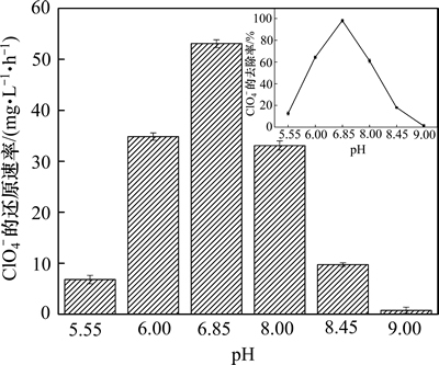 在初始pH分别为5.55,6.00,6.85,8.00,8.45和9.00下进行实验,得出不同pH对ClO4-平均还原速率的影响,结果如图3所示。图3表明:初始pH对ClO4-去除影响显著。当pH为6~8时,ClO4-还原速率较高,且当pH为6.85时,ClO4-在24 h内的去除率接近100%;当pH偏酸(5~6)或偏碱(8~9)时,ClO4-平均还原速率迅速下降,pH为5.55和8时,ClO4-在24 h内的去除率分别为12.6%与18.0%,而当pH为9时,24 h内基本无ClO4-的还原。因此ClO4-还原的最适pH为6.85左右,系统过酸过碱都不利于微生物的活动,与WU等[12]发现最适pH=8和XU等[6]发现的最适pH=7.5~8.0的结果基本一致。