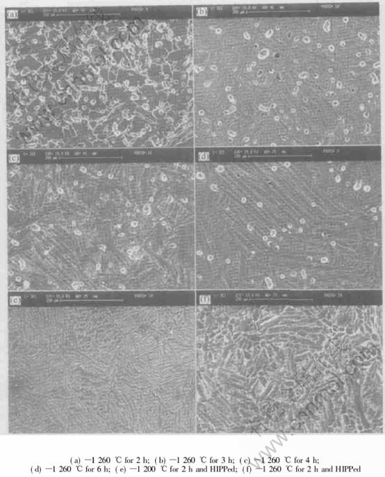 Fig.8 shows morphology of pores of A2 powder specimens under different sintering conditions. As sintering time was increased, porosity obviously decreased and pores became smooth and uniformly-distributed from Fig.8(a) to Fig.8(c). It is clear from Fig.8(d) to Fig.8(f) that directly-HIPPed products, specimens after 1200℃ pre-sintering and HIPPed treatment, specimens after 1260℃ pre-sintering and HIPing treatment had a porosity of 0.8%, 0.4% and 0.2%, respectively. HIPing treatment could eliminate all closed poresin the compacts and obviously improve mechani-