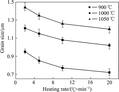 Fig. 1 Relationship between grain size of ZnO targets and heating rate at different sintering temperatures