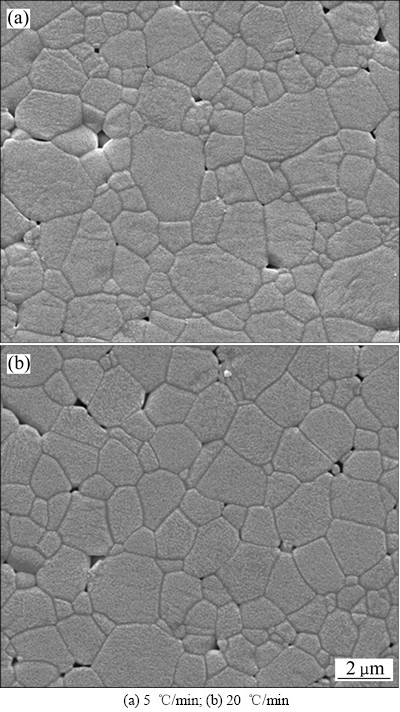 KELLETT等[16]指出无论在烧结中期还是烧结后期,晶粒生长是烧结过程中连续致密化的必要条件。但因晶粒生长是一个强烈依赖时间的过程,提高升温速率意味着坯体可以在更短时间内达到烧结所需温度,抑制晶粒过分长大。