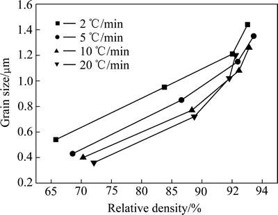 图3 不同升温速率下ZnO靶材的相对密度与晶粒尺寸的关系曲线