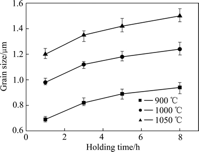 图4 不同烧结温度下ZnO靶材的晶粒尺寸与保温时间的关系
