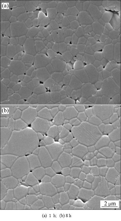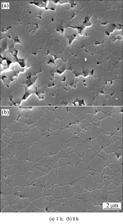 图10所示为ZnO在升温速率为5 ℃/min、烧结温度1000 ℃下烧结不同时间的SEM像。由图10可知,保温1 h时,部分晶界明显,开孔孔隙较多,致密化不完全,相对密度较低(见图10(a))。保温时间增至8 h时,靶材内部晶界明显,晶粒长大,孔隙主要以闭孔孔隙存在于3个或4个晶粒交接处,靶材相对密度明显增大(见图10(b))。因此,适当延长保温时间可有效增加ZnO靶材的相对密度。