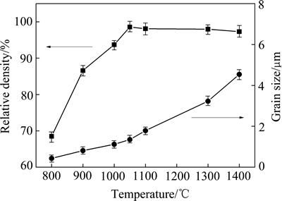 Fig. 6 Relative density and grain size of ZnO targets at different sintering temperatures