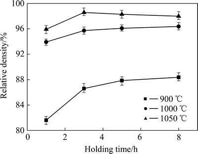 Fig. 9 Relationship between relative density of ZnO targets and holding time at different sintering temperatures
