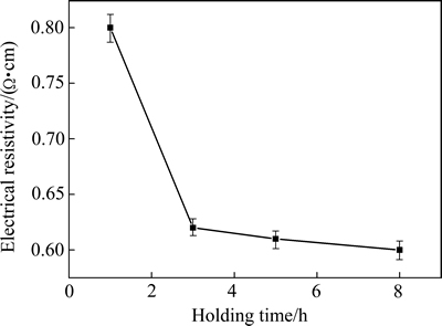 图12所示为1100 ℃烧结不同保温时间下ZnO陶瓷靶材的电阻率变化。由图12可知,保温时间由1 h增加至3 h时,由于靶材致密度逐渐增大,内部气孔减少,继而导致电阻快速下降。继续延长保温时间,电阻率变化较小时,这是由于靶材致密化已完成,延长保温时间会使部分晶粒长大,减弱晶界对自由载流子的散射作用。HAN等[29]研究ZAO靶材的电阻率与保温时间时也发现相同现象,保温时间由1 h延长至2 h时,电阻率明显下降,继续延长保温时间,电阻率减少不明显。