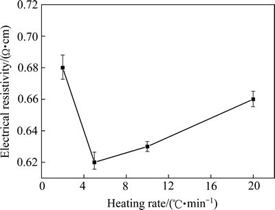 图13所示为1100 ℃烧结时不同升温速率下ZnO靶材的电阻率变化。由图13可知,当升温速率由2 ℃/min提高到5 ℃/min,电阻率下降明显。随升温速率的继续升高,电阻率反而增加。这可能是因为升温速率较快,靶材内部晶界迁移较快,气体无法排出,导致部分孔隙无法消除。而气孔的存在则增大对自由载流子的散射几率,致使靶材的电阻率增大。BOMLAI等[30]研究升温速率对钛酸锶钡陶瓷的电阻率影响时也发现类似现象,他们认为随升温速率增加,晶粒尺寸不仅减小而且更加均匀,导致电阻率下降。