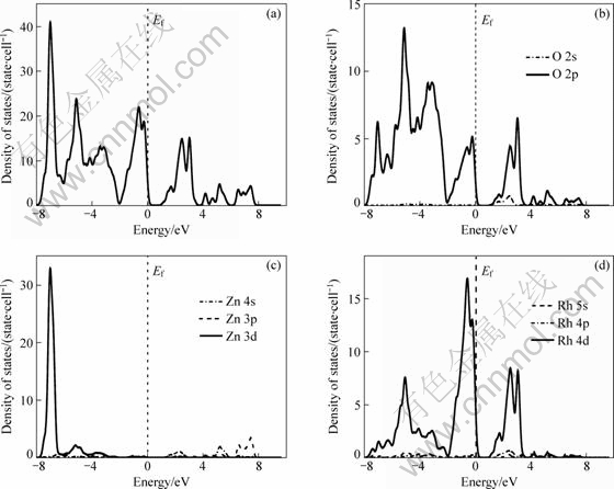 Fig.3 Total density of states of ZnRh2O4 (a) and partial density of states of O (b), Zn (c) and Rh (d)