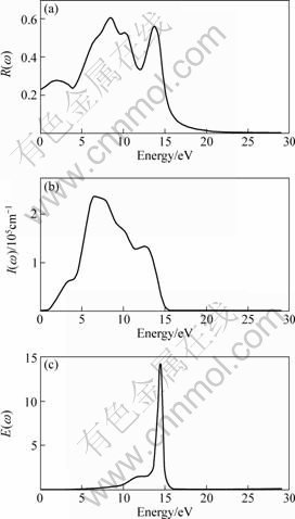 Fig.6 Optical reflectivity spectrum (a), absorption coefficient (b) and energy-loss spectrum (c) of ZnRh2O4