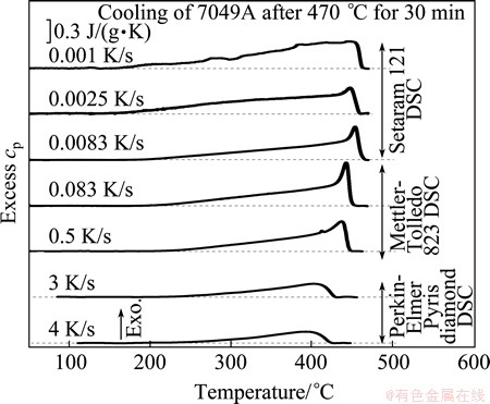 The quenching step was varied from very slow (near to equilibrium) up to very fast rates where precipitation was expected to be suppressed. Slow cooling experiments from 0.0005 K/s to 0.025 K/s were executed in a heat flow type DSC Setaram 121 [10]. Sample dimensions were about 6 mm (diameter)×22 mm (mass of about 1850 mg). Samples were placed in standard aluminium crucibles. The cooling rates in the intermediate range from 0.083 K/s to 0.5 K/s were performed employing the heat flow type Mettler Toledo DSC 823, 822. The optimal samples for these rates and this device had typical dimensions of about 5.4 mm in diameter and 1.4 mm in height, which results in a sample mass of approximately 96 mg [10]. The samples were placed in standard aluminium crucibles. The fastest DSC which was used in the range from 0.6 K/s to 4 K/s was the Perkin Elmer Pyris 1 DSC. This type of DSC had a typical power compensation scheme. The sample had dimensions of 4 mm in diameter and 1 mm in height. The dimensions result in a sample mass of about 30 mg. These samples were placed inside pure aluminium crucibles. Excess specific heat capacity was calculated from all experiments and evaluation was performed according to the results by MILKEREIT et al [10]. It is important to mention that for the excess specific heat capacity calculation baseline experiments have to be performed each time. In this case the reference material mentioned above was used in both furnaces of the device. Thereby, the difference between specific heat capacity of EN AW 7049A and EN AW 1050 was calculated.
