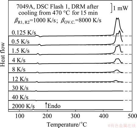 Fig. 3 Differential heat flow of aluminium alloy EN AW-7049A during reheating after cooling with rates from 0.125 K/s to 2000 K/s