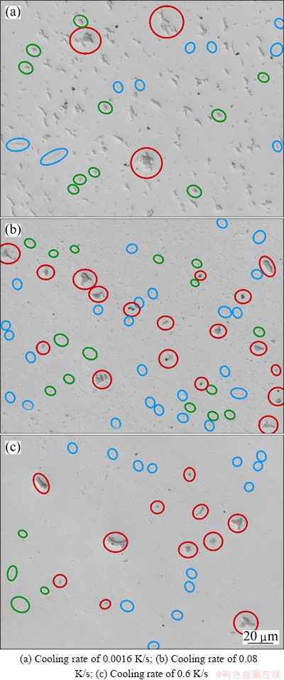 Figure 6 demonstrates microstructures of aluminium alloy EN AW 7049A (light microscopy) after cooling at rates of 0.001, 0.08 and 0.6 K/s, respectively. All images show three types of precipitates. The first type is large (a few 10 μm) precipitates in irregular shape (red circles). Their sizes do not depend on cooling rate, namely, they are primary precipitates. The second type is polygonal shaped precipitates (green circle). Their sizes decrease with increasing cooling rate from about 10 μm at 0.001 K/s to about 1 μm at 0.6 K/s. The third type is needle-shaped precipitates (blue circles). Their lengths decrease with increasing cooling rate from about 10 μm at 0.001 K/s to about 1 μm at 0.6 K/s. After a cooling rate of 0.6 K/s, the last two types are hardly visible although the precipitation heat still amounts about 30 J/g (Fig. 5). A large number of smaller precipitates must be present and will be investigated by scanning electron microscopy.