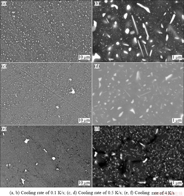 Figure 7 shows the SEM images of aluminium alloy EN AW-7049A after cooling with rates of 0.1, 0.5 and 4 K/s. Polygonal and needle-shaped secondary precipitates are also visible in SEM images. Their chemical composition was measured by energy dispersive X-ray analysis. Both of them contained large amounts of zinc, magnesium and copper. Due to relative slow cooling, these precipitates are assumed to be equilibrium phases like h-Zn2Mg and S-Al2CuMg. Their sizes decrease with increasing cooling rate from a few μm at 0.1 K/s to a few 0.1 μm at 4 K/s.
