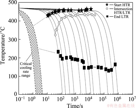 The precipitation start and end temperatures of the overall reaction as well as the intersection between high- temperature (HTR) and low-temperature reaction (LTR) were evaluated from the conventional DSC- measurements. The corresponding time-temperature data points were plotted in a time-temperature diagram. Figure 8 shows the resulting continuous cooling precipitation diagram of EN AW-7049A after solution annealing at 470 °C for 30 min and the chemical compositions as listed in Table 2. The time scale is scaled logarithmic. The critical cooling rate range detected by DFSC is identified by a hatched cross pattern.