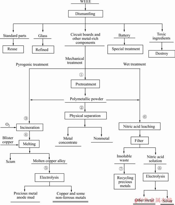 Fig. 1 Flow sheet of dismantling of WEEE and extracting metal from WPCBs