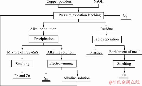 针对WPCBs传统熔炼工艺回收铜和贵金属过程中存在的锡铅锌等金属的分散和有机物燃烧释放有害气体的问题,提出了一种废印刷线路板铜粉源头除杂的技术路线,即废印刷线路板铜粉首先经过碱性加压氧化浸出,使锡、铅和锌溶解进入溶液,同时使铜箔表面残存的塑料和阻焊油与铜箔分离,碱性加压浸出液经过硫化净化后电积产出金属锡,而浸出渣通过摇床分选得到含塑料的轻颗粒物和含铜的重颗粒物,重颗粒物经过熔炼后得到粗铜,工艺流程见图2。