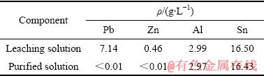 3) 碱性加压氧化浸出液采用硫化沉淀脱除铅和锌,铅和锌的沉淀率达到99.5%以上,浸出液净化沉淀产物可作为铅冶炼的优质原料;净化后液采用电沉积回收溶液中的锡,阴极锡中锡含量达到98%。