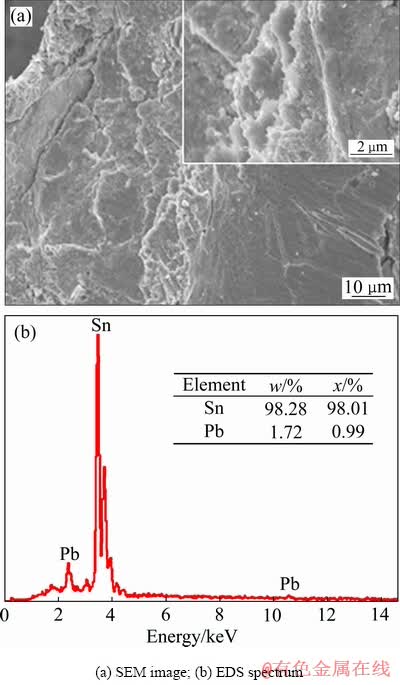 温度65 ℃、槽电压2.5 V、电流密度100 A/m2、时间4 h和溶液循环流速5 L/min,净化后液电积产物的SEM-EDS分析结果如图4所示。由图4可以看出,电积产物较为均匀并呈现密实的片层状结构,EDS分析结果表明电积产物中锡含量达到98%,此外,电积产物中含极少量的铅,这是由残留于净化后液的微量Pb电积所导致的。电积后液可以返回碱性加压氧化浸出工序循环利用。
