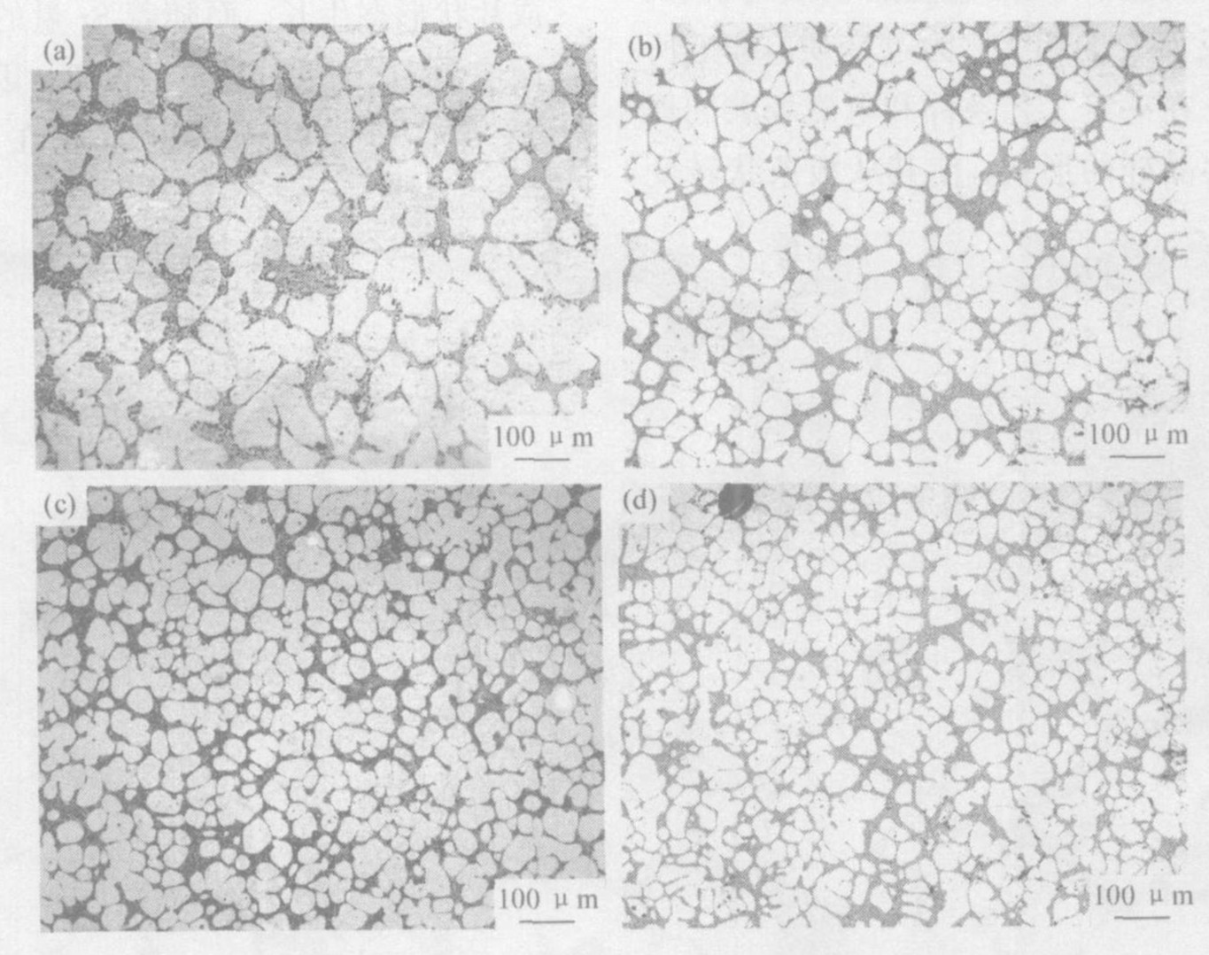 图1 α-Al基本的形貌随AlSi6Mg2合金中Ti含量的变化情况 (a) 0%; (b) 0.04%; (c) 0.08%; (d) 0.12%Fig.1 Changes of morphology and size of α-Al vs. Ti content in AlSi6Mg2 alloy