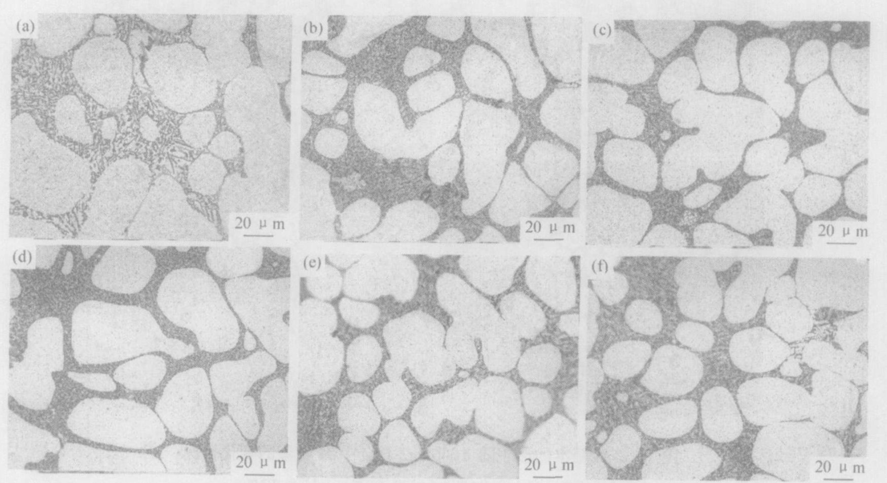 图2显示了AlSi6Mg2合金中共晶硅形态与大小随合金中Sr含量的增加的变化情况。 有图比较看出, 图2 (a) 为未变质, 共晶硅呈板条状, 图2 (b, c) 共晶硅未完全变质, 仍有部分共晶硅呈细条状, 图2 (d, e) 为完全变质, 共晶硅呈点状或短簇状。 图2 (f) 共晶硅反而变的粗大, 为过变质。 综上所述, 一定量的Sr在一定工艺条件和电磁场共同作用下能够改善共晶硅的形貌, 使其从板条状转变为点状或短簇状, 大大改善了合金的组织。 细小的共晶硅组织能够提高合金的力学性能, 特别是塑韧性能够大幅度提高, Sr变质后得到的细小的Si相在以后的固溶处理过程中易于溶解并发生钝化和球化, 而Sr变质前, 粗大的板条状Si相割裂α-Al基体, 恶化材料的力学性能, 并且固溶处理很难消除粗大的Si相及板条状Si相的危害, 同时Sr变质对于提高热处理综合性能特别是延伸率也是有利的, 因而在制备半固态AlSi6Mg2合金过程中加入一定量的Sr微量合金化元素是有益而必要的。 研究发现, 在现有的实验条件下, 半固态加工专用合金AlSi6Mg2中Sr含量为0.02%~0.04%时最佳。