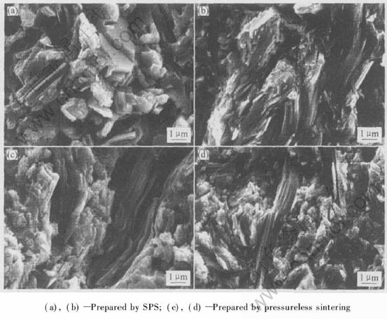 SPS烧结材料的断口形貌见图1(a), 1(b)。 由图可见, 材料呈多晶结构, 取向性不甚明显。 分别与同成分的无压烧结材料相比(图1(c), 1(d)), SPS烧结材料的微观形貌呈块体状, 而无压烧结材料组织较疏松。 采用排水法测量, 得出SPS法制备的材料密度为(6.65±0.15)×103 kg/m3, 而采用无压烧结法制备的材料密度只有(6.15±0.15)×103 kg/m3。