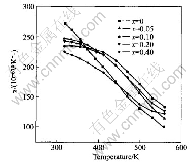 材料的Seebeck系数(α)随温度的变化规律见图3。 由图可知, 所有试样的α值均为正值, 说明材料属p-型半导体, 合金AlxBi0.5Sb1.5-xTe3 (x=0.05~0.4)的α值均由室温单调随温度下降。 三元合金Bi0.5Sb1.5Te3的下降速率较快, 从室温附近的273