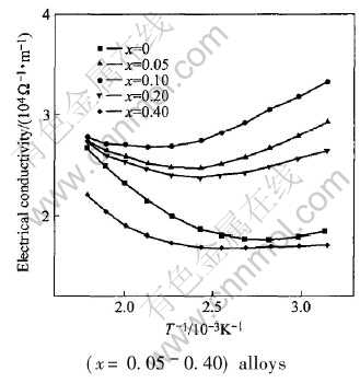 Fig.4 Temperature dependence on electrical conductivities of AlxBi0.5Sb1.5-xTe3 (x=0.05-0.40) alloys