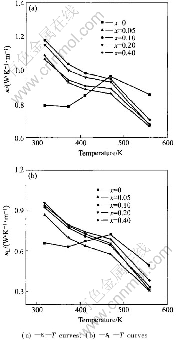 Fig.5 Temperature dependence on thermal conductivities of quaternary AlxBi0.5Sb1.5-xTe3(x=0.05-0.40) alloys