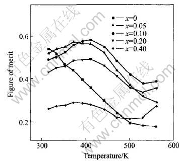 图6所示为半导体材料的无量纲优值ZT与温度的关系。 三元合金Bi0.5Sb1.5Te3的热电优值随温度升高而下降, 最大优值(ZT=0.54)出现在室温附近; 而在300K时采用热挤压法制得的材料最大优值为0.88[15]。 四元合金AlxBi0.5Sb1.5-xTe3 (x=0.1)的最大ZT值出现在411K, 其值为0.58, 是同温度下典型三元Bi0.5Sb1.5Te3合金的1.6倍, 但在室温附近两者无明显区别。 对于四元合金AlxBi0.5Sb1.5-xTe3 (x=0.05~0.40), 出现最大ZT值的温度均向右移动。 原来在室温附近显示最优性能的Bi2Te3基合金, 通过多组元成分设计后其最佳性能逐渐向高温方向移动。