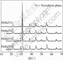 1) PMS-PZT piezoelectric ceramics with pure perovskite phase were synthesized by traditional ceramics process. With the amount of PMS increasing, the phase structure of PMS-PZT ceramics changes from tetragonal phase to rhombohedral phase. The optimum sintering temperature of PMS-PZT ceramics is 1 200 ℃-1 250 ℃.