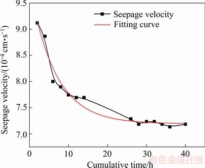 图9显示,浸出液渗流速率随着累计浸出时间的增加而不断减小,且降幅在累计时间12 h前最为明显,之后降幅减缓,到累计浸出时间为24 h逐渐趋于稳定。对渗流速率曲线进行线性回归可得浸出液渗流速率与累计浸出时间的关系,如式(4),拟合相关系数为0.9598: