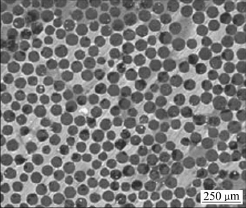 图2所示为纤维体积分数55%的CF/Al复合材料的横向显微组织,可以看出真空压力浸渗制备的复合材料微观组织致密,纤维在基体合金中分布均匀,基体合金与纤维的界面结合良好,不存在基体合金缩孔缩松及纤维偏聚等微观组织缺陷。